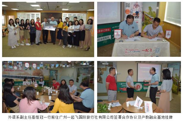 2019年5月11日,外语系副主任高恒冠一行前往广州一起飞国际旅行社有限公司开展走访顶岗实习员工工作和《产教融合基地》签约授牌仪式。一起飞旅行社总经理Dicky、人力资源经理Susan以及外语系部分顶岗实习员工出席了交流及签约仪式。