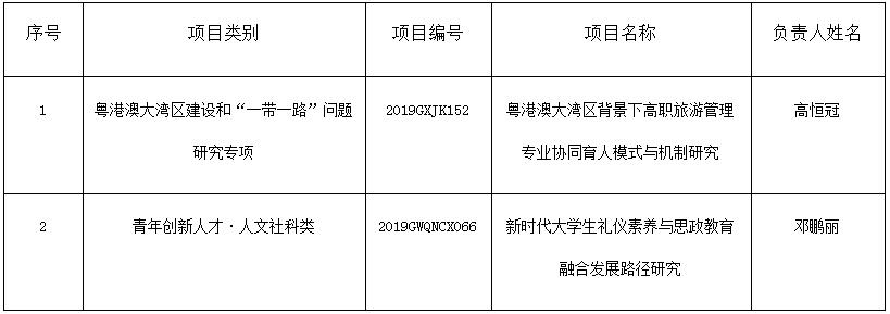外语系2个项目获得广东省教育厅2019年度普通高校科研项目立项 发布日期:2020年04月03日 00:00 访问量:次 近日,根据《广东省教育科学规划领导小组办公室关于公布广东省教育科学“十三五”规划2019年度高校哲学社会科学专项研究项目立项名单的通知》和《广东省教育厅关于公布2019年度普通高校认定类科研项目立项名单的通知》,经公司初审遴选及推荐,省教育厅评审或认定,我系2个项目获准立项,其中,粤港澳大湾区建设和“一带一路”问题研究专项1项,青年创新人才·人文社科类项目1项。立项名单详见下表。 广东省教育厅2019年度普通高校科研项目立项一览表 上一条:中国战“疫”故事 下一条:外语系举办“松山之星”十佳导游大赛 【关闭】