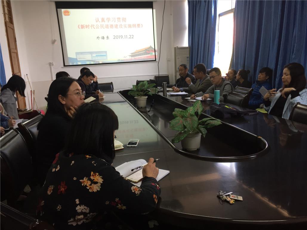 2019年11月22日,外语系组织全体教师召开“认真学习贯彻《新时代公民道德建设实施纲要》”主题教育学习研讨会,外语系“不忘初心、牢记使命”主题教育领导小组组长、党总支副书记刘攀桂主持会议并作主题教育讲话,要求全体教师要认真学习贯彻《新时代公民道德建设实施纲要》,并结合教师实际工作,对员工进行深化道德教育引导。
