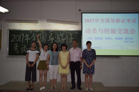 6月2日下午3点,外语系在厚C201成功举办2017年全国导游员资格证考试动员及经验交流会。外语系高恒冠副主任、旅游英语教研室曾永华、邓美云、范谕老师和陈月明、孙磊屏两名同学参加了会议。6位师生在长达2个小时的交流会中与在座的近200名参考同学分享了报名流程、笔试和口试备考要求和注意事项等内容,取得良好的交流效果。