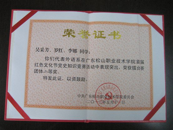 外语系代表队获公司党史知识擂台赛二等奖 发布日期:2012年05月11日 00:00 访问量:次 外语系代表队获公司2012年党史知识擂台赛二等奖 上一条:外语系开展安全知识学习竞赛活动 下一条:外语系2012外语风采大赛圆满落幕 【关闭】