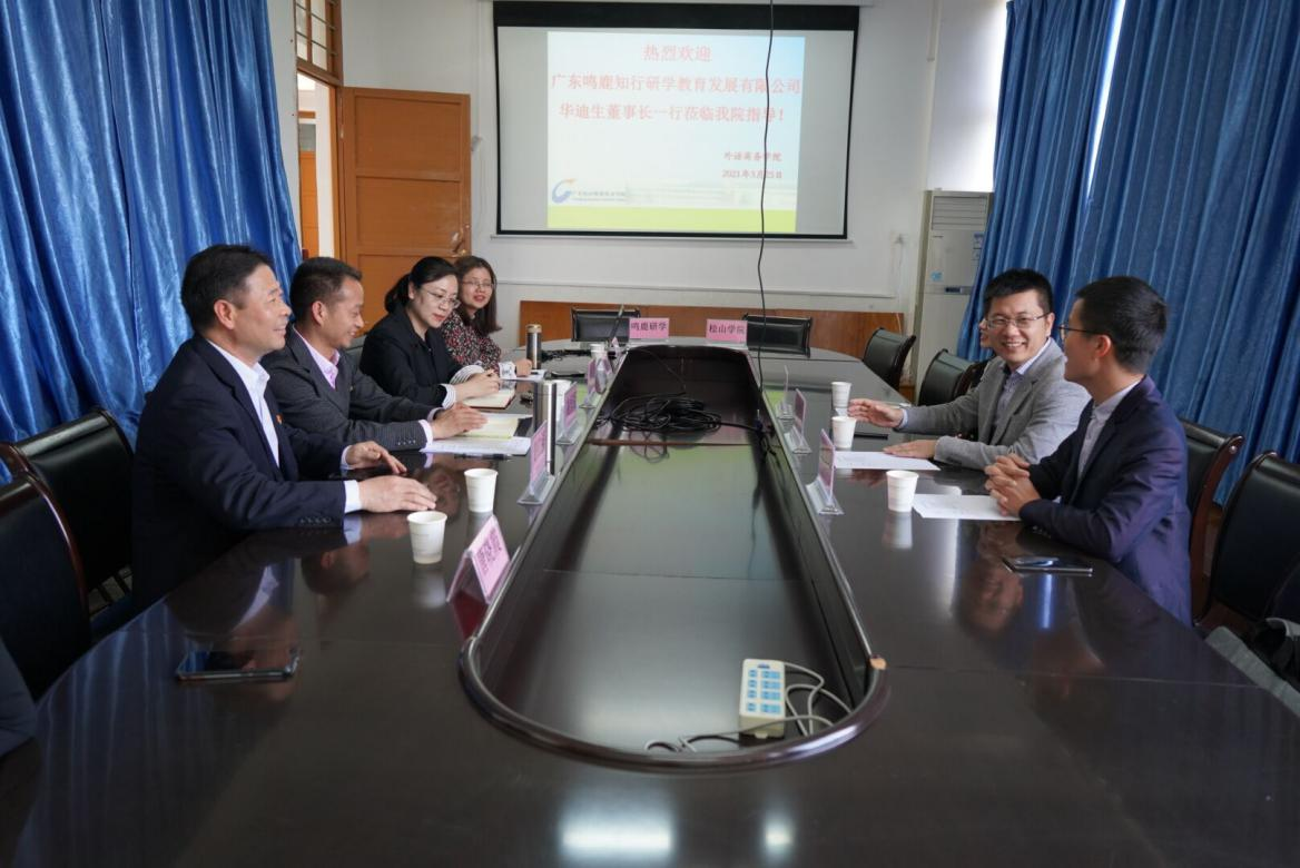 为进一步深化职业公司产品改革,全面推进产教深度融合,3月25日下午,广东鸣鹿知行研学教育发展有限公司(以下简称“鸣鹿知行研学”)董事长华迪生、总经理张云龙以及韶关市知行人才培训中心副总经理邓文娟莅临威廉希尔体育开展校企合作交流,并出席校企合作签约仪式。威廉希尔体育党总支副书记黄仁强、副经理高恒冠,校企合作中心副主任李炎及相关教研室负责人参加活动。
