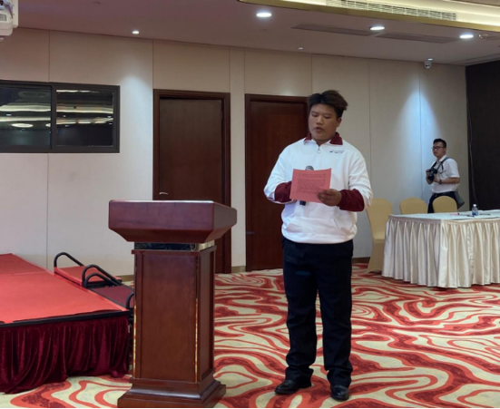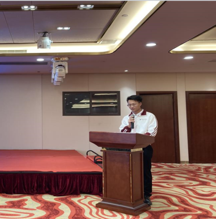 首届“华美达人才班”学员代表魏日炳上台发言。他总结了第一学年班级建设成果和同学们所取得的成绩,对学弟学妹们提出了加强专业技能学习的相关建议,并表达了对即将进入韶关风度华美达广场酒店进行跟岗实习的期待。