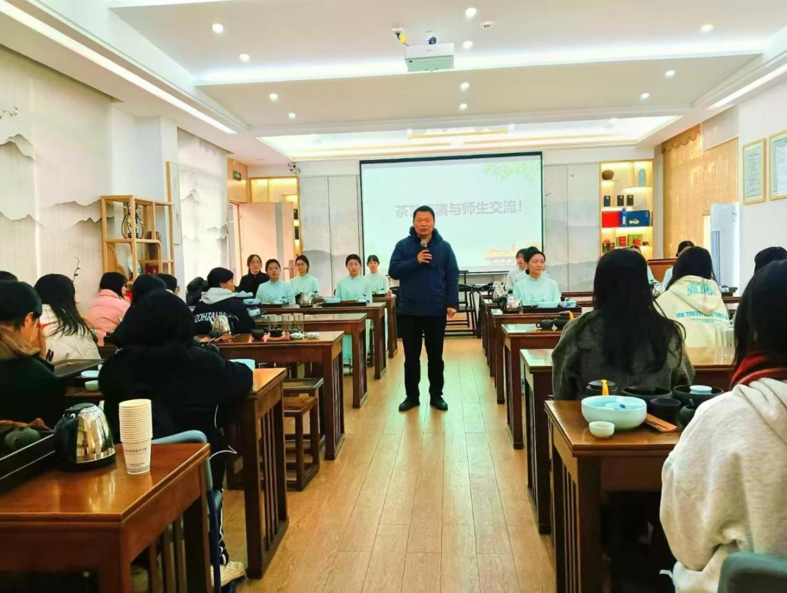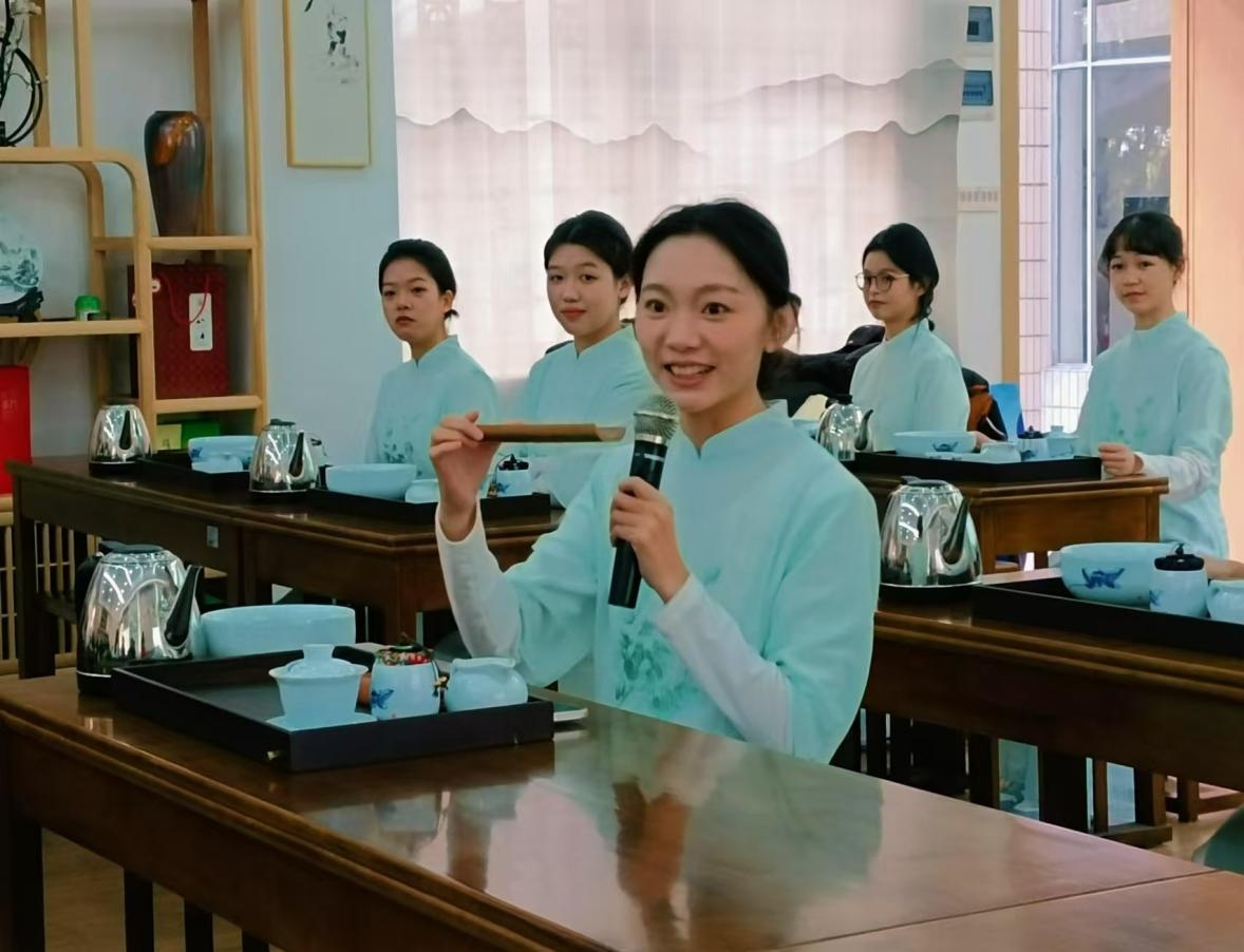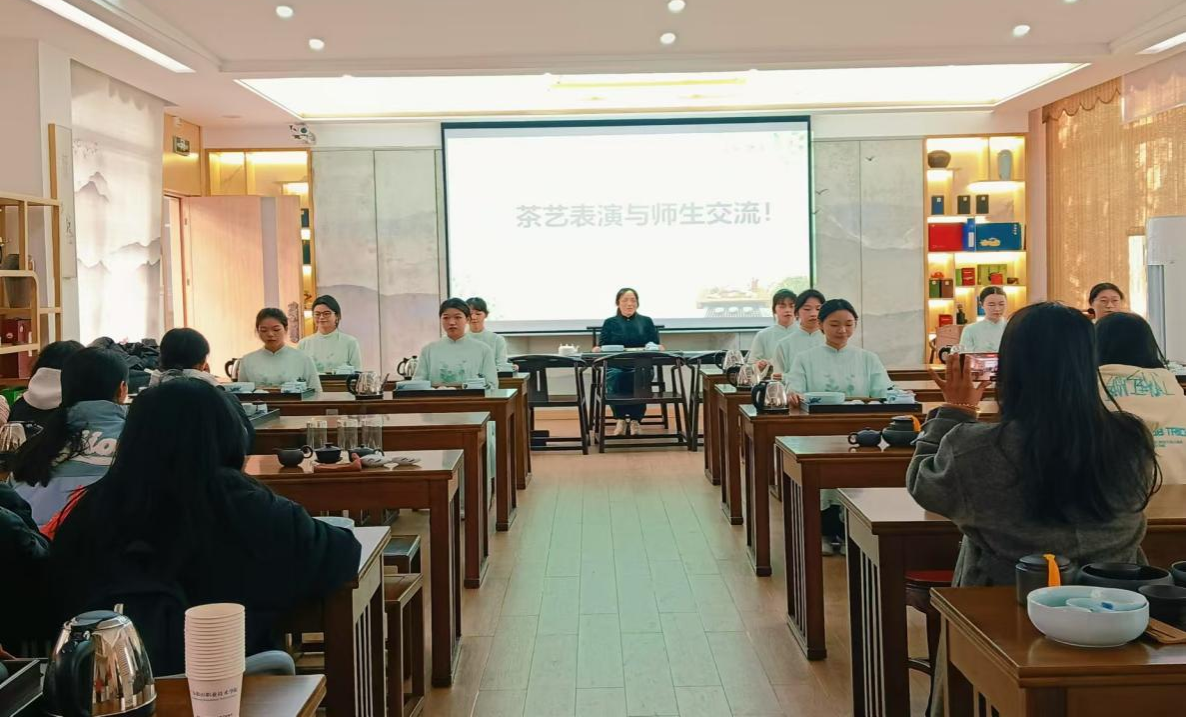 公司在交流活动中特别设置了专业讲解与分享环节,外语商务院师生代表分别给员工分享了导游研学活动、茶艺表演,展示了专业教学风采。